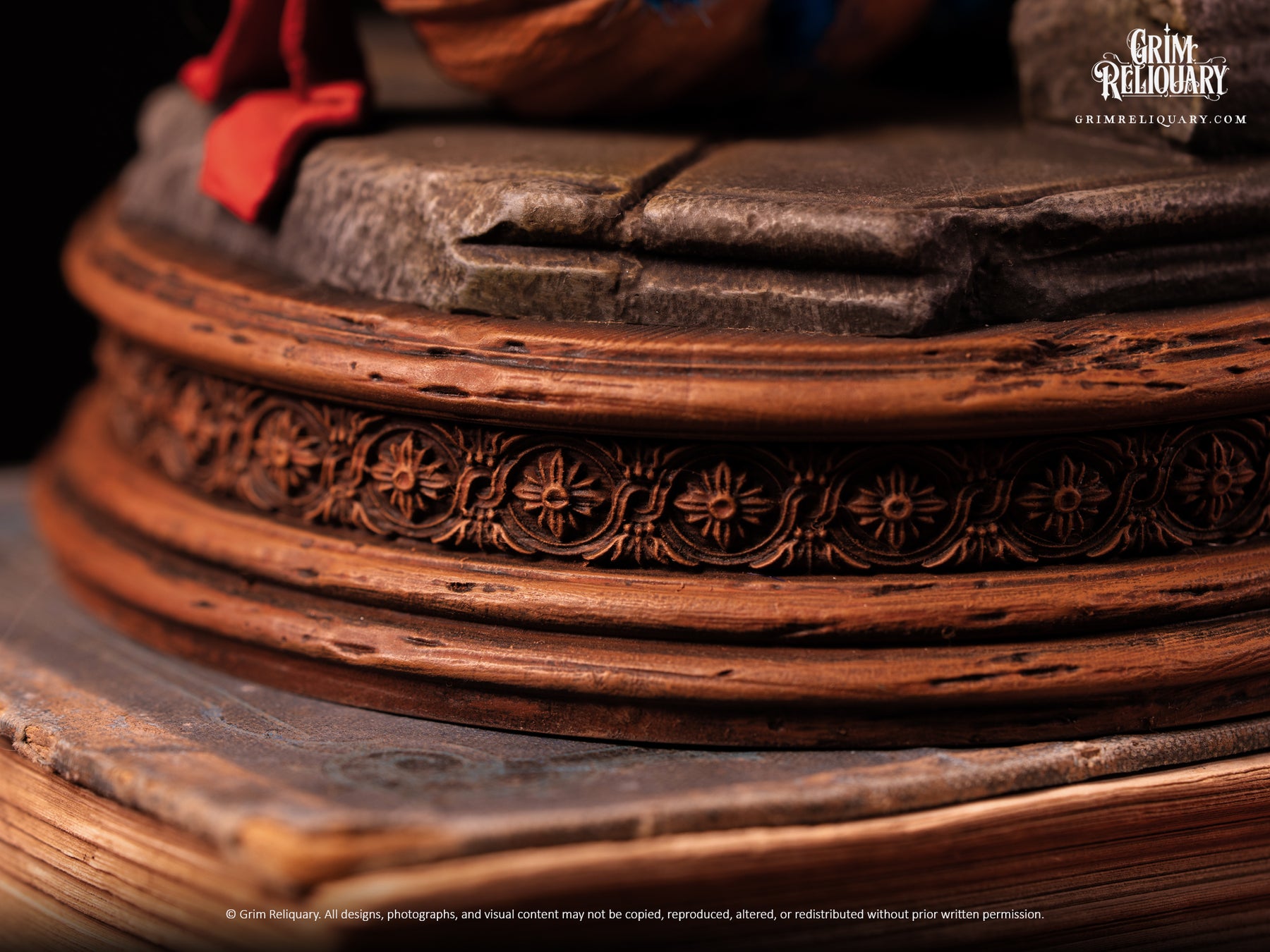 Inspired by the iconic worm from Labyrinth, this piece focuses on realism, texture, and presentation. The sculpt features lifelike surface detail and is enhanced with real hair, adding depth and organic character. The figure is mounted on a beautifully sculpted base designed to resemble ornate carved wood, giving it a refined, display-ready finish.