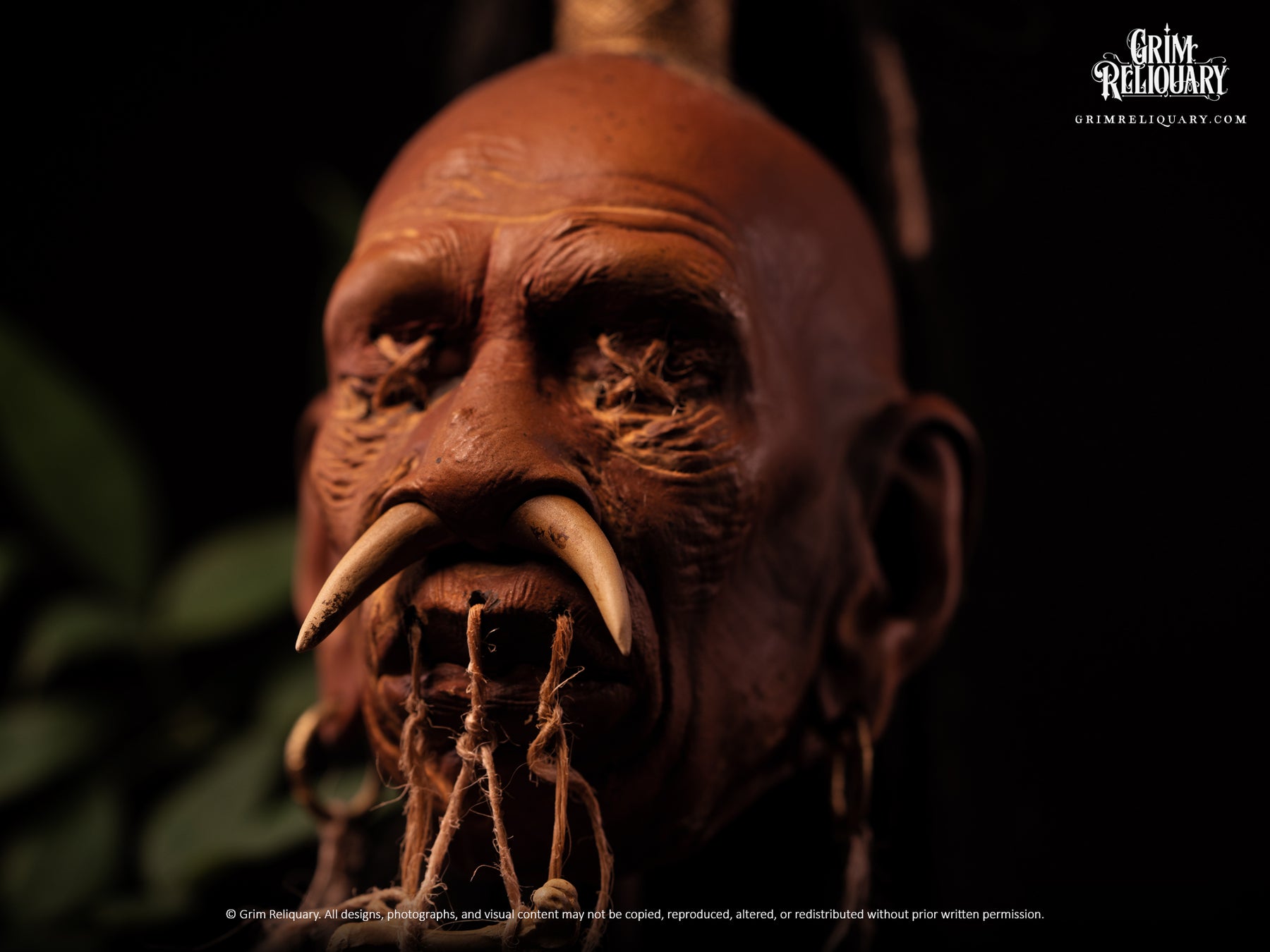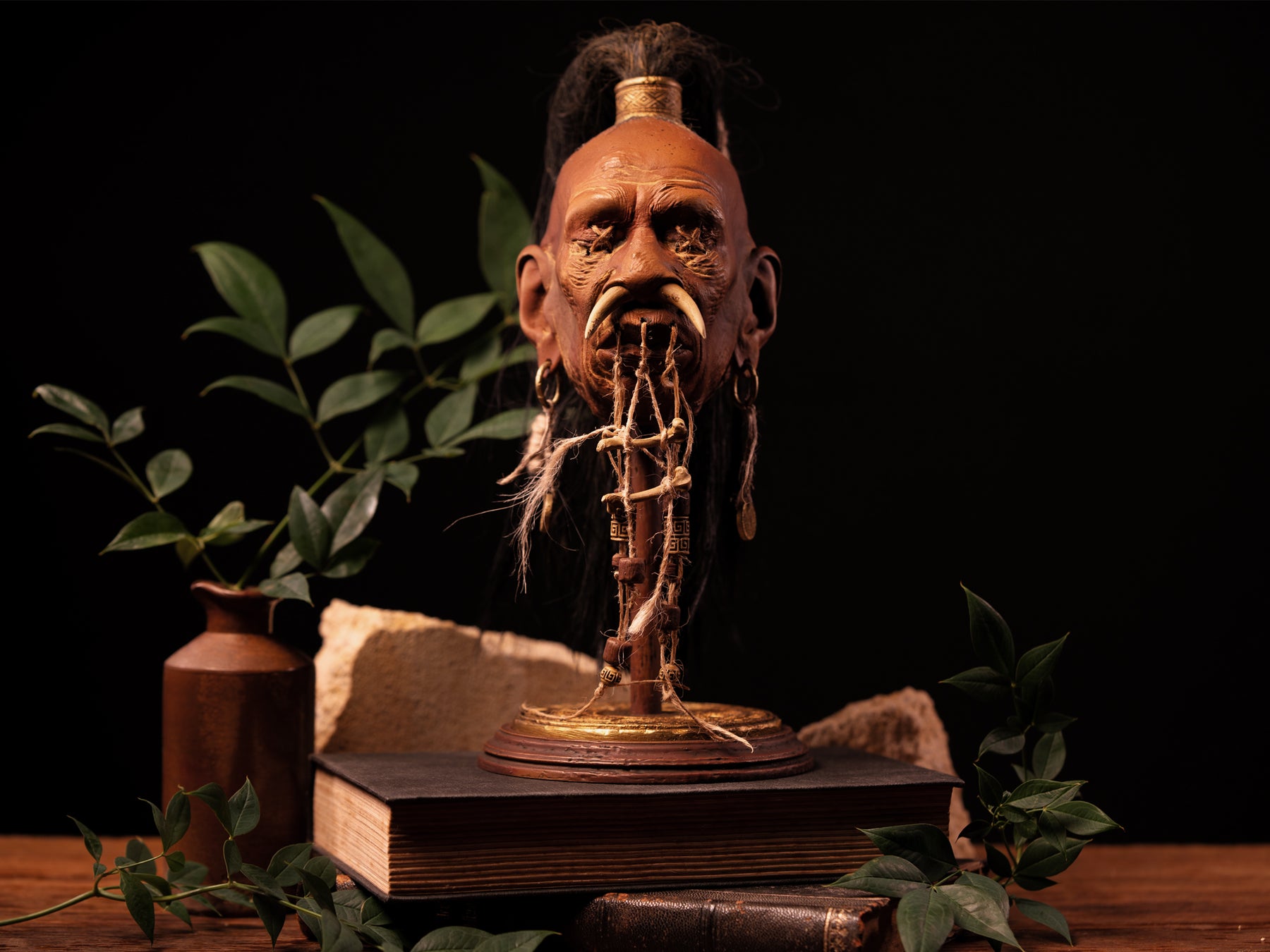 Digitally sculpted for realism, the head features aged skin textures, hand-painted weathering, and a realistic top-knot hairstyle. Aztec-inspired jewellery and twine detailing add layered authenticity, while the sculpted base grounds the piece as a display object rather than a prop. Inspired by shrunken head lore and ancient Mesoamerican and Peruvian aesthetics, this artefact feels equally at home in a cabinet of curiosities or a modern dark décor setting.