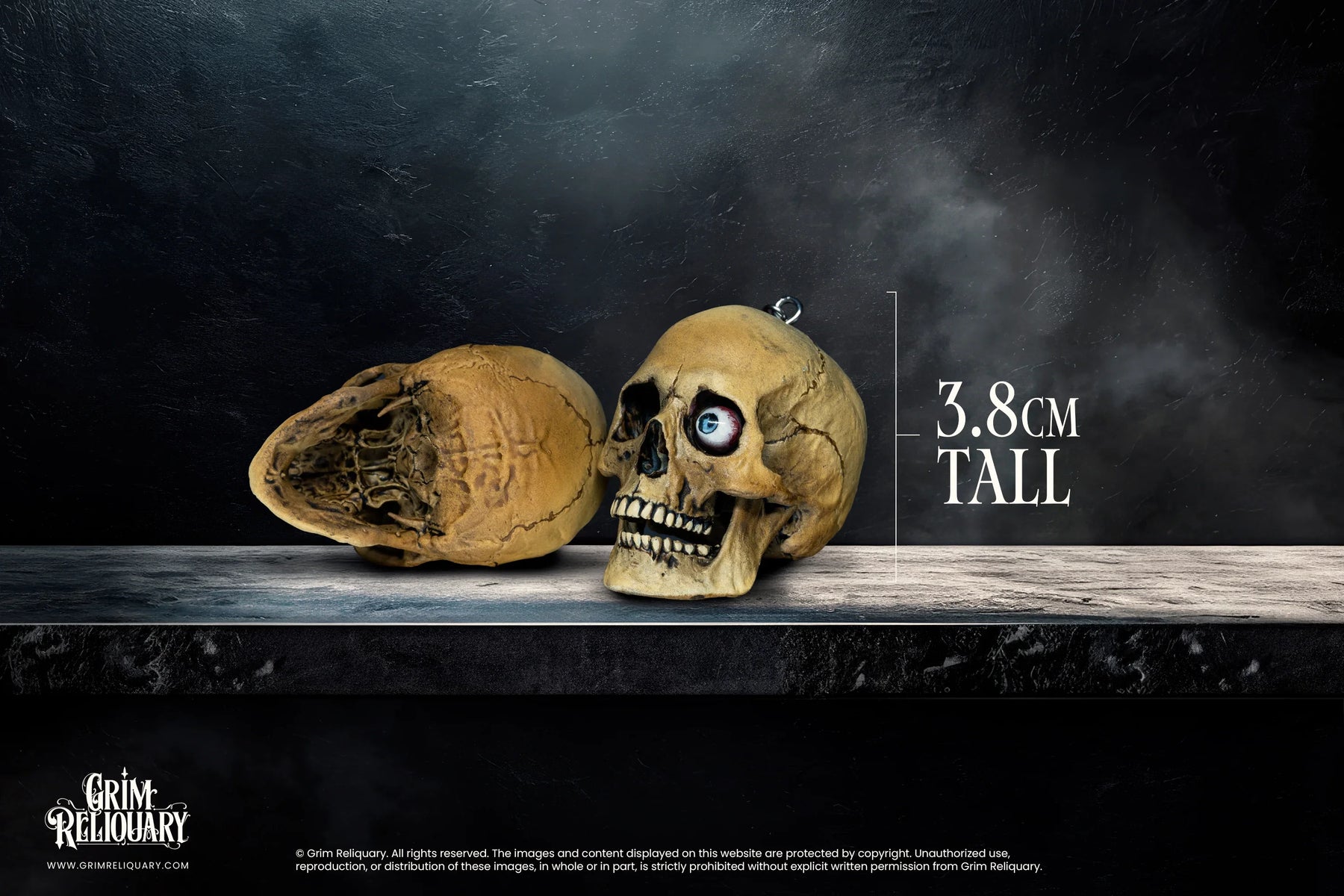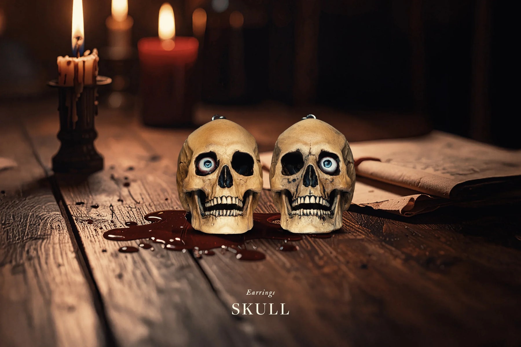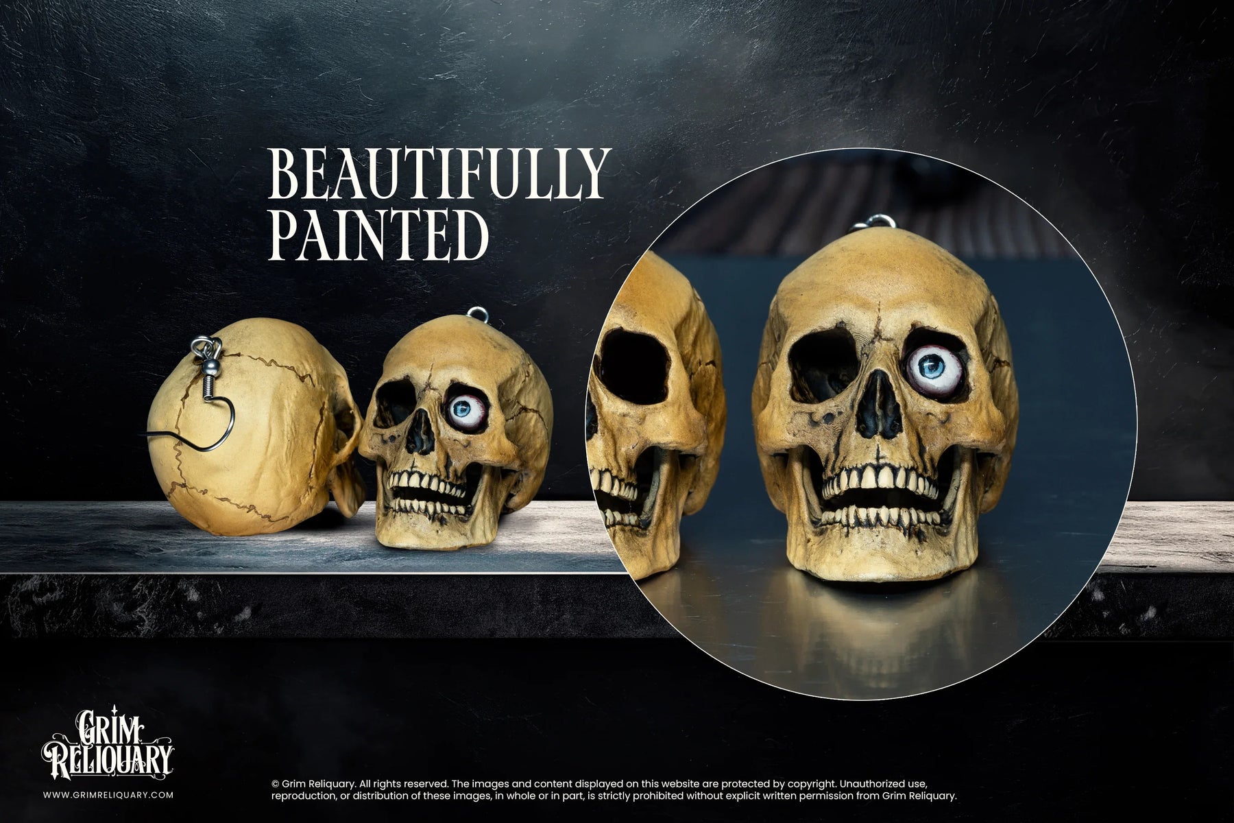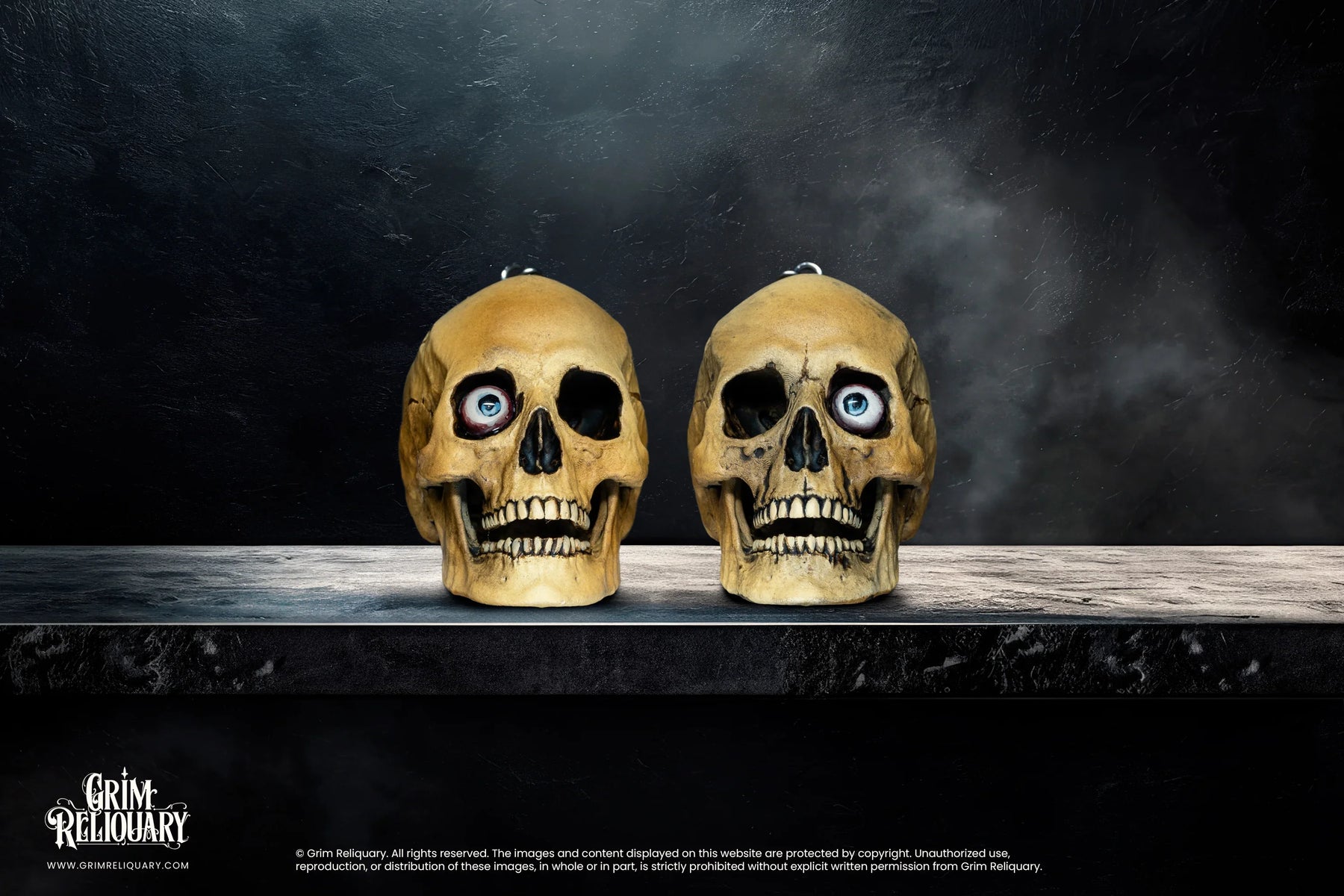 • Handmade horror-inspired skull earrings with eyeball detail.