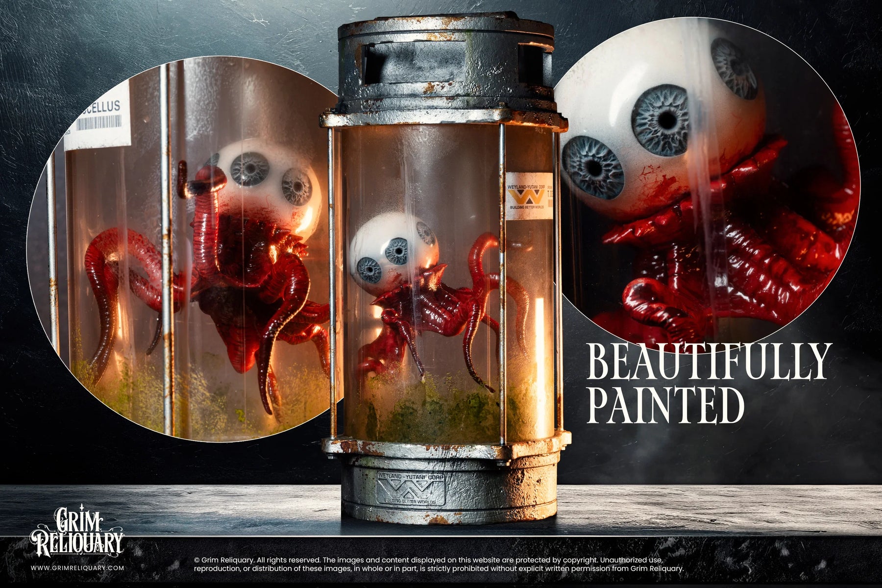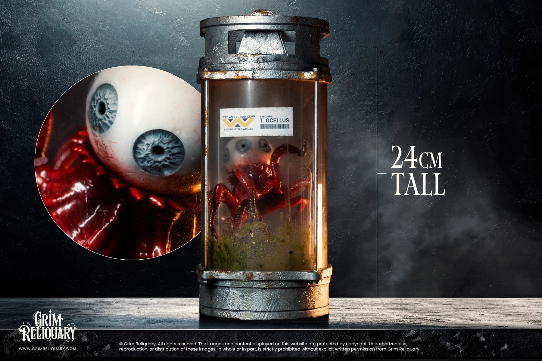 A strange and unsettling relic awaits - our handmade T.Ocellus Specimen Replica is a lifelike alien eyeball sealed in its eerie containment capsule.